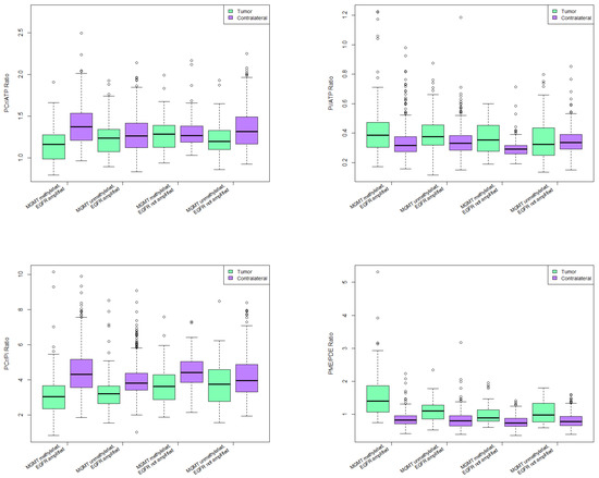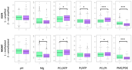 EGFR amplified tumors had significantly lower PCr/ATP (p = 0.002) and PCr/Pi (p < 0.0001) ratios, and higher Pi/ATP (p = 0.006) and PME/PDE ratios (p < 0.0001). Patients with MGMT-methylated tumor had significantly higher Mg values (p = 0.01) and PME/PDE ratio (p < 0.0001), while their PCr/ATP (p = 0.03) and PCr/Pi (p = 0.04) ratios were lower (Figure 3).