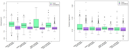 Cerebral magnesium was significantly higher in patients with MGMT methylation and no EGFR amplification in tumor and contralateral side (p < 0.0001). Mg in tumor voxels of patients with MGMT methylation and EGFR amplification was significantly higher than in tumor voxels of patients with MGMT unmethylated tumors and no EGFR amplification with p = 0.02 (Figure 4).