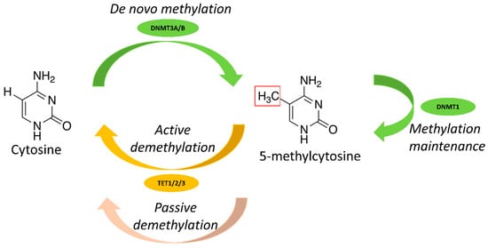 DNA methylation is one of the most described epigenetic mechanism, and it plays an essential role in gene expression regulation and chromatin organization [17]. In this process, a methyl group is added to the fifth carbon of cytosines in CpG sequences to form 5-methylcytosine (5mC). In mammals, DNA methylation is predominantly found at cytosines in symmetrical CpG dinucleotide base pairs. Indeed, 70–80% of them are methylated, although they represent only 3–8% of all cytosines. CpG dinucleotides are enriched in genomic areas called CpG islands (CGIs) that are frequently present at gene promoters and are, therefore, poorly methylated. CGI methylation is often associated with transcription repression and long-term silencing [17].