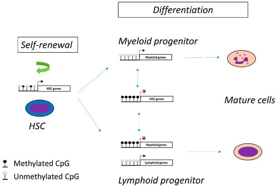 Hematopoiesis is a dynamic process that proceeds in a hierarchical manner. Multipotent HSCs give rise to oligopotent progenitors that then differentiate into uni-potent progenitors committed towards a specific lineage. This model is finely regulated and controlled. DNA methylation plays an essential role in cell plasticity, lineage commitment and cell differentiation. Indeed, DNA methylation contributes to the maintenance of HSC stemness and participates in cell differentiation [25] (Figure 2). Thus, the methylation profile differs according to the differentiation stage and the cell type. For instance, myeloid progenitors are characterized by lower global DNA methylation than lymphoid cells where DNA methylation silences the myeloid differentiation program [26,27].
