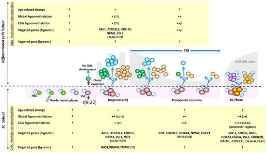 The DNA methylation profile of cancer or leukemia cells can be correlated with prognosis. For instance, in chronic lymphocytic leukemia, three prognostic subgroups, identified on the basis of DNA methylation data, globally correlate with other prognostic factors [121,122,123,124,125]. In CML, several studies have identified DNA methylation changes in the promoter of some genes in the advanced phases of the disease, for instance hypermethylation of the ABL1 [80], cell cycle-regulating genes [43], CEBPA [81], PU-1 [79], CALCA [82], HOXA4 or HOXA5 [63] gene promoters. Moreover, global DNA methylation studies have found a clear increase in DNA methylation alterations in BC cells. As advanced CML phases are more resistant to TKIs, some DNA methylation abnormalities could be correlated with therapeutic resistance. Moreover, it has been reported that some DNA methylation changes correlate with imatinib resistance, such as hypermethylation of HOXA4 [63], BIM [83], OSCP1 or NPM2 [38]. These observations suggest that some DNA methylation marks may be related to TKI susceptibility and/or resistance. Subclonal evolution may emerge under treatment, but only four genes have been related to treatment resistance thus far. More studies are needed to identify other DNA methylation marks.