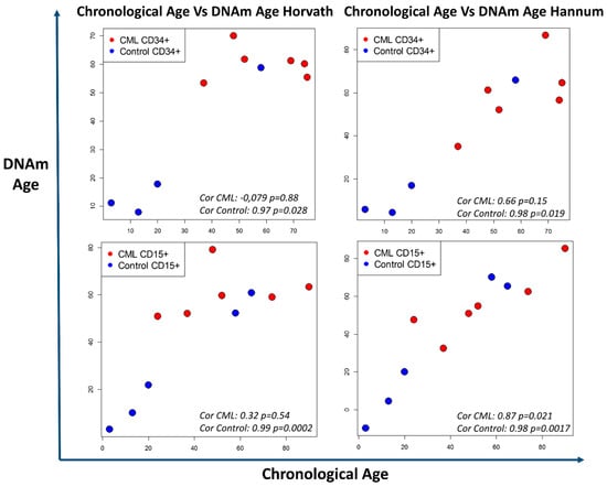 Discrepancy between chronological age and biological age evaluated with two DNA methylation clocks. Methylation data (HM450K chip) from Maupetit-Mehouas et al. [77] were analyzed with the DNAm age calculator based on the algorithms described by Horvath [104] and Hannum [105]. The method and R function is described in [104]. Results are presented in graphical form with chronological age (x-axis) versus the DNA methylation (DNAm) age (y-axis) for CD34+CD15- and CD34-CD15+ CP-CML cells at diagnosis (red dots) and control cells (blue dots) from healthy donors. Overall, chronological age and biological age were comparable in control cells. Conversely, biological age was altered in CP-CML samples, particularly in CD34+CD15- cells, showing accelerated cell aging in the youngest patients and a slower cell aging in older patients. Statistical test: Pearson correlation test.