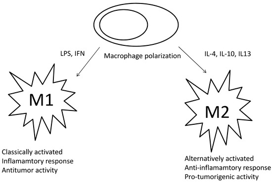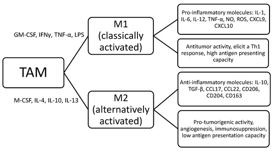 Since the 1990s, immunohistochemical (IHC) analyses have shown many macrophages in the tumor microenvironment (TME) [7,8]. This infiltration could be induced by tumor cells by secreting molecules such as chemokine ligands with a C-C motif (CCL) or C-X3-C motif (CXCL) and granulocyte–macrophage colony-stimulating factor (GM-CSF) [9,10,11,12,13]. A high number of macrophages has been frequently observed in both solid and hematological malignancies, and it was first considered as a mechanism involved in anticancer surveillance [14,15]. However, several reports demonstrated that the so-called tumor-associated macrophages (TAM) could conversely contribute to oncogenesis and neoplastic progression as “bad guys”, by promoting genetic instability and angiogenesis, while reducing the immune response and apoptosis [4,16,17,18].