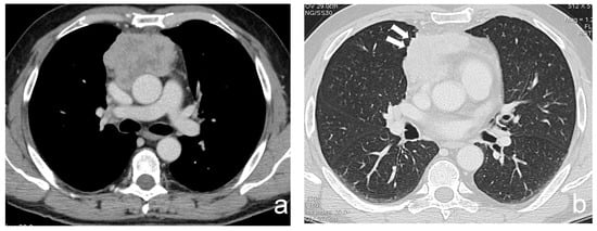 (a,b) A 63-year-old man with a poor differentiated squamous thymic carcinoma invading the pericardium and the lung (stage IIIa). Margins of the lesion are multilobulated and indented at the interface with the lung; the latter CT finding is better demonstrated using a lung window (arrows).