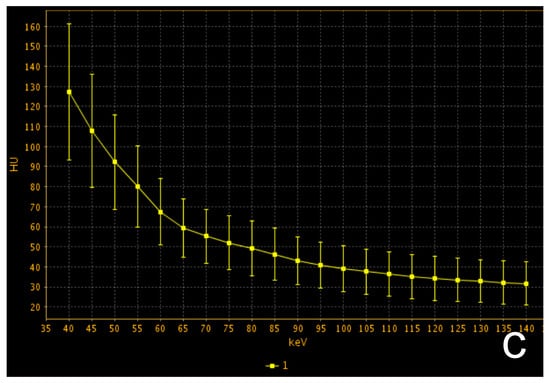Dual-energy CT (DECT) indicates the acquisition of CT data derived from two different photon energies so that different materials can be better characterized by evaluating the difference in attenuation at these two energies [17]. Thanks to technical improvement, DECT images can be obtained with a radiation exposure not significantly different from that of a conventional single-energy CT. The scans can be performed by using different technical approaches: dual-source, single source with rapid switching, single source twin beam and dual-layer detector. Raw data can be elaborated at a dedicated workstation, thus achieving a set of monoenergetic images ranging from 40 to 140 keV and material-specific images, such as iodine and water-related. Given the increased attenuation of iodine at a low energy level, low energy series enhance lesion conspicuity with several advantages in oncologic imaging. Moreover, DECT is not affected by beam hardening artifacts, and it is possible to accurately quantify iodine uptake of tissue with better characterization of different lesions [18,19] (Figure 3).