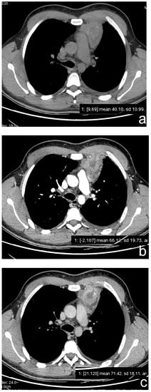 - Xie, Y.; Zhang, S.; Liu, J.; Liang, X.; Zhang, X.; Zhang, Y.; Zhang, Z.; Zhou, J. Value of CT spectral imaging in the differential diagnosis of thymoma and mediastinal lymphoma. Br. J. Radiol. 2019, 92. [Google Scholar] [CrossRef]