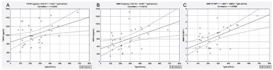 Correlations between serum concentrations of TgAb and TNFR1 (A), MMP-9 (B), MMP-9/TIMP-1 ratio (C) in patients with papillary thyroid cancer associated with autoimmune thyroiditis.