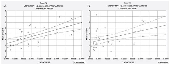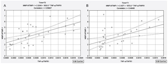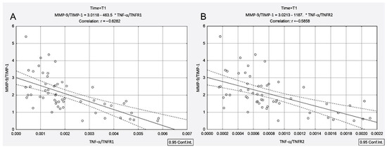 Moreover, the TNF-α/TNFR1 and TNF-α/TNFR2 ratios were positively correlated with the MMP-9/TIMP-1 ratio both before and 4 days after 131I administration (Figure 2A (T0): rTNF-α/TNFR1-MMP-9/TIMP-1 = 0.59, p < 0.001; Figure 2B (T1): rTNF-α/TNFR1-MMP-9/TIMP-1 = 0.48, p = 0.005 and Figure 3A (T0): rTNF-α/TNFR2-MMP-9/TIMP-1 = 0.63, p < 0.001; Figure 3B (T1): rTNF-α/TNFR2-MMP-9/TIMP-1 = 0.46, p = 0.007).