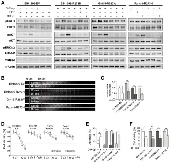 One of the consequences of EGFR stimulated recycling seen in GOF mutp53 cells is an enhanced EGFR activation and signaling mostly through the AKT pathway [19,35]. Accordingly, EIH1299-R273H cells compared with EIH1299-EV cells that do not express mutp53 responded to both EGF and TGF-α displaying higher activation of EGFR, ERK and AKT (Figure 2A). D-Prop did not affect the activation of the EGFR in any of the mutp53 cells, but nevertheless decreased the activation of both ERK and AKT. The decrease in ERK activation depended on the cell line, mostly affecting EIH1299-R273H and G-415-R282W but not Panc-1-R273H cells (Figure 2A and Figure S2). More remarkable was an almost complete abrogation of AKT activation in all mutp53 cell lines (Figure 2A). Therefore, D-Prop effectively counteracts signaling pathways associated with invasive migration, survival and malignancy of mutp53-expressing cells [19,35].