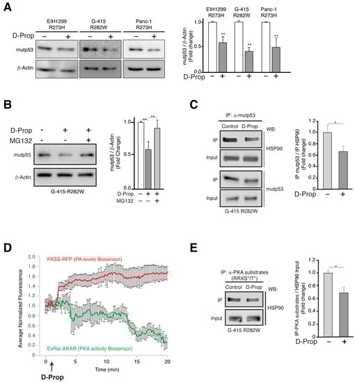 Strikingly, we unexpectedly found that D-Prop treatment for just 1 h decreases close to 50% the mutp53 levels assessed 24 h later, affecting both DNA-contact R273H and conformational R282W mutp53. This effect includes EIH1299 cells expressing R273H mutp53 under an inducible promoter and is abrogated by proteasome inhibition, indicating that D-Prop activates a mutp53 degradation pathway. Co-immunoprecipitation assays point to HSP90 as an effector of this pathway. HSP90 is a PKA substrate [42] and we find that D-Prop treatment decreases its phosphorylation by PKA and releases its interaction with mutp53. This suggests that HSP90 protective interaction with mutp53 is regulated by PKA activity, thus opening new possibilities of pharmacological reduction of mutp53 levels, including the use of D-Prop.