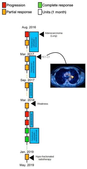 A 61-year-old man (patient 5) was seen in August 2016 for cough and progressive shortness of breath (especially during effort) of three months’ duration. He had a history of hypertension, and he was a smoker (35 pack/year over the previous 20 years), with no family history of cancer. CXR showed a ground-glass opacity in the LUL. Pneumonia was suspected, and he was treated with antibiotics. One month later he underwent follow-up CXR, which still showed the RML ground-glass opacity. A CT scan showed a LUL mass (5.5 cm × 4.6 cm). PET-CT showed hypermetabolic uptake in the LUL mass, hypermetabolic uptake and enlargement of the mediastinal and retroperitoneal LNs, and hypermetabolic uptake in the left femur and left pelvis (up to 1 cm), and a biopsy finding of adenocarcinoma of lung origin. There was no evidence of brain metastases. The tumor tissue was positive for KRAS, STK11, and PDL1 < 24%. The patient received systemic intravenous chemotherapy and vascular endothelial growth factor therapy consisting of pemetrexed (500 mg/m2), cisplatin (75 mg/m2), and bevacizumab (15 mg/kg), all given on day 1, every 21 days for 5 cycles. In March 2017, treatment was changed to a combination of chemoimmunotherapy pemetrexed (same dosage) and pembrolizumab (at a dosage of 200 mg) on day 1, every 21 days, with a complete metabolic response. Six months later, pemetrexed was stopped and the patient continued treatment with pembrolizumab (same dosage) but stopped in March 2018 due to weakness and fatigue. One month afterward the patient reported improvement of symptoms; however, PET-CT showed a hypermetabolic left hilar and sub pancreatic uptake. Thereafter, pembrolizumab (same dosage) was represcribed for three cycles, but there was further disease progression. The patient received systemic intravenous chemoimmunotherapy consisting of pemetrexed (500 mg/m2) plus carboplatin (dosed to AUC-5) and pembrolizumab (at a dosage of 200 mg) on day 1, every 21 days for 4 cycles. In January 2019, mild local progression (in the lung) of the disease was seen, so hypofractionated radiation therapy to the left hilar and to the mediastinum was added (30 Gy in 10 fractions), and treatment with pemetrexed was continued. In May 2019, PET-CT showed progression of the disease in several sites, including the groin, iliac, mediastinum, and neck. Treatment with pembrolizumab and ipilimumab was then initiated for four cycles; this was followed by further progression of the disease, exhibited by PET-CT. The patient went through dissection of the inguinal LN confirmed by pathologic testing to be a TTF1-positive adenocarcinoma lesion. Next, chemotherapy treatment was renewed with cisplatin (75 mg/m2) and pemetrexed (500 mg/m2). After the fourth cycle, the patient showed stable disease. In January 2020, the patient was treated with pembrolizumab (at a dosage of 200 mg) on day 1, every 21 d and lenvatinib (at a dosage of 20 mg daily). One month later, significant regression of the lesions was seen with improvement in lung findings and a decrease in the diameter of LNs; three months afterward, the mediastinal lesion was decreased by half of its size. A PET-CT from May 2020 showed no further disease progression. At this stage, the lenvatinib dosage was decreased to 14 mg daily because of aggravation of mouth ulcers. The patient continued the combined treatment, which stabilized his disease with no adverse events for a period of 10 months, at which time the patient suffered a sudden deterioration, eventually leading to death (Figure 5).