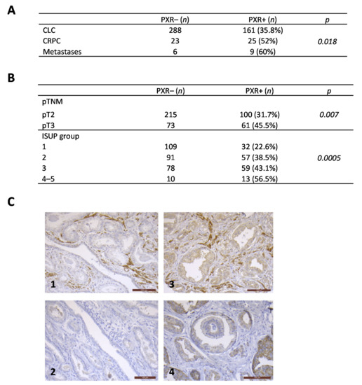 PXR expression in prostate cancer samples. (A) PXR expression increases with disease progression, from CLC to metastases (p = 0.018). (B) PXR staining depending on the pTNM status or on the ISUP group. PXR was more frequent in pT3 tumors when compared with pT2 (p = 0.007), and in tumors with high ISUP score when compared with tumors with lower ISUP score (p = 0.0005). (C) Representative immunostainings showing a positive correlation between PXR and CYP3A4 expressions (p = 0.0006): most tumors negative for PXR (1) were also negative for CYP3A4 (2), and most tumors that express PXR (3) also express CYP3A4 (4). PXR: Pregnane X Receptor. CLC: clinically localized cancers. CRPC: castration-resistant prostate cancers. Scale bars correspond to 100 μm.