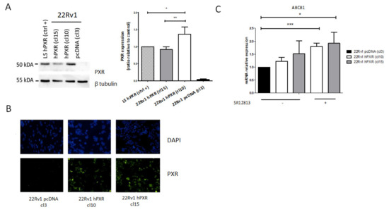 Previous studies have demonstrated the potential role of PXR in prostate cancer cell sensitivity to taxane-based chemotherapies [27], but its role in the sensitivity to targeted therapies was not investigated though many kinase inhibitors have been tested in that indication. To address this issue, we first verified the PXR status of DU145, PC3, and 22Rv1 cell lines that are usually used to mimic the advanced form of the disease and found that PXR was not expressed in these models (Figures S1A and S9). We chose the 22Rv1 human prostate carcinoma epithelial cell line to generate stable clones expressing PXR. These cells derived from the androgen-dependent CWR22 xenograft that was propagated in mice after castration-induced regression [29] and express both full length AR and its AR-v7 splicing variant and are poorly responsive to androgens. We transfected 22Rv1 cells with either an empty vector or a plasmid expressing the human PXR and the luciferase reporter gene under the control of PXR responsive elements (XREM 3A4-Luc+). We selected by limiting dilutions two clones that stably expressed PXR (clone 10 and clone 15) and a control clone (clone 3). Western blot experiments showed that PXR was expressed in both clones 10 and 15 to a similar level than in the LS-hPXR colon cancer cell line used as a positive control, whereas it was not detected in the control clone (Figure 2A and Figure S9). These data were confirmed by immunofluorescence labeling (Figure 2B). We also verified that PXR was functional in both clones 10 and 15 using a luciferase reporter assay. The results clearly showed that the activation of PXR by the reference PXR agonist SR12813 was associated with enhanced bioluminescent signal in both clones 10 and 15 (Figure S1C), demonstrating that PXR bound to its response elements present in the reporter plasmid and was transcriptionally active. The functionality of PXR was further evaluated by RT-qPCR on the PXR target gene ABCB1. The results in Figure 2C show that stable expression of PXR was associated with a significant increase in the mRNA levels of ABCB1 in clones 10 and 15 compared with control clone, and that this expression was further enhanced by cell treatment with SR12813 (Figure 2C).