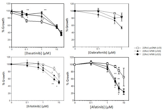 These clones were then used to study the effect of PXR on 22Rv1 cell sensitivity to a panel of 13 clinically approved kinase inhibitors. We showed that stable expression of PXR was associated with a resistance of 22Rv1 cells to dasatinib and a higher sensitivity to dabrafenib, erlotinib, and afatinib (Figure 3). Interestingly, this effect was particularly pronounced for the ErbB blocker afatinib. Indeed, at a concentration of 3 µM, which corresponds to its IC50 in both clones 10 and 15 expressing PXR, it barely affected cell growth of the control clone (Figure 3).