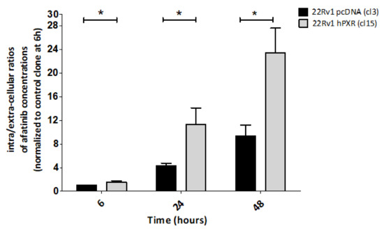 Because afatinib was identified as a potential substrate of ABCB1 and ABCG2 transporters [30], we first investigated whether PXR-mediated sensitization of 22Rv1 cells to afatinib was accompanied with a change in its transport. For this purpose, 22Rv1-hPXR clone 15 and control clone were incubated with 1µM afatinib and intracellular concentrations of the drug as well as concentrations in the culture supernatants and were measured at 6, 24, and 48 h following treatment, using a mass spectrometry approach according to the protocol detailed in the Materials and Methods section. The ratios between intracellular and extracellular concentrations of afatinib in the control clone and in clone 15 stably expressing hPXR were calculated as a function of time and were normalized to the one obtained for the control clone at 6 h (set at 1). The results clearly show an increase in intracellular concentrations of afatinib as a function of time in clone 15 (Figure 4).