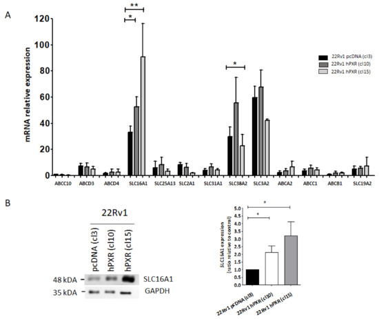 Effects of PXR on the expression of drug transporters. (A) Comparison of the expression levels of a set of 13 genes that were identified using the RT2 Profiler™ PCR Array Human Drug Transporters from Qiagen between 22Rv1 clones 10 and 15 stably expressing PXR and control clone (clone 3) as measured by RT-qPCR. Gene expression was normalized to the expression of HPRT and plotted relative to the expression of the ABCC10 gene expression in the control clone (set at 1). Results are the mean ± SEM of at least three independent experiments. (B) Immunoblot analysis of SLC16A1 expression in control clone and clones 10 and 15. GAPDH was used as a loading control and quantification was performed using the Image J software. Results are plotted as ratios of SLC16A1 expression relative to control clone and are the mean ± SEM of three independent blots. Statistical analyses were carried out using Student’s t-test and considered statistically significant for p < 0.05 (*) or p < 0.001 (**), respectively.