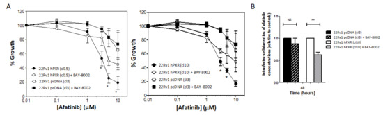 To confirm the functional implication of SLC16A1 in the influx of afatinib, we used the BAY-8002 derivative, a specific inhibitor of this influx transporter [32]. We first studied the cytotoxicity profile of BAY-8002 in 22Rv1 cells and found that concentrations of up to 1 mM did not have a significant impact on cell growth (Figure S5). We then compared the effects of afatinib on the growth of 22Rv1 clones expressing hPXR and on the control clone in the absence and in the presence of 10 µM BAY-8002.