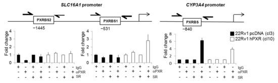 Next, we used a chromatin immunoprecipitation (ChIP) assay to investigate whether PXR could bind to these potential response elements. In the absence of SR12813, no significant binding of PXR was observed neither to the SLC16A1 nor to the CYP3A4 gene promoter region used as a control, regardless of the expression of PXR (Figure 7). Conversely, cell treatment with SR12813 (6 µM, 48 h) increased up to ~three-fold the recruitment of PXR to the PXRBS1 binding site in clone 10 stably expressing PXR. A similar increase in PXR binding to the promoter region of CYP3A4 was also observed in both clones 10 and control clone 3, with 3.88- and 6.25-fold variation, respectively. Similar results were obtained using the 22Rv1 clone 15 (Figure S7). Unexpectedly, binding of PXR to the SLC16A1 promoter was not accompanied with a significant increase in SCL16A1 mRNA levels following treatment with SR12813, though a trend was observed for clone 10 (~1.5-fold) at 48 h and was of the same order of magnitude as the one that was observed for the PXR target gene ABCB1 (Figure 2C). Nevertheless, using primary hepatocytes as a more physiological model, a similar increase in SLC16A1 mRNA levels of ~four-fold was also observed following treatment with the PXR agonist dabrafenib (Figure S6), further suggesting that SLC16A1 is a PXR target gene.