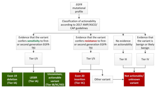 Flowchart used for classification of EGFR mutational profiles. Grouping of EGFR mutational profiles included in this study, based on the frequency of the mutation(s) and the corresponding AMP/ASCO/CAP level of evidence for actionability with first- or second-generation EGFR-TKI. Groups in green (Exon 19 deletion, L858R and Uncommon, actionable variants) are considered sensitive to first- or second-generation EGFR-TKI, groups in red (Exon 20 insertion and Not actionable/unknown variants) are considered resistant to first- or second-generation EGFR-TKI. In case of a double variant, actionability was assessed for the combination. However, if evidence for the combination was lacking, the patient was assigned according to the highest tier of the individual variants. Abbreviations: AMP, Association for Molecular Pathology; ASCO, American Society of Clinical Oncology; CAP, College of American Pathologists; EGFR, epidermal growth factor receptor gene; TKI, tyrosine kinase inhibitor.