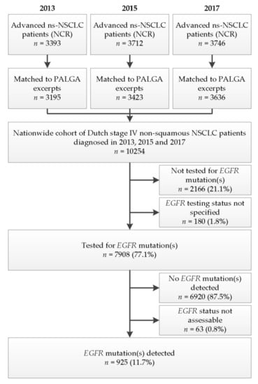 Patient selection. Flowchart depicting the selection of patients for inclusion in this study. Abbreviations: EGFR, epidermal growth factor receptor gene; PALGA, Dutch Pathology Registry; NCR, Netherlands Cancer Registry; ns-NSCLC, non-squamous non-small cell lung cancer.