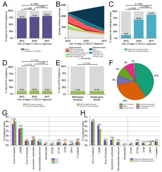 EGFR testing rates, methods and EGFR mutations. (A) Percentage of patients tested for EGFR mutations, by year of diagnosis. (B) Distribution of EGFR testing methods in number of tests by year. (C) Percentage of patients tested with single-gene versus multi-gene assays, by year of diagnosis. (D,E) Percentage of patients tested for EGFR mutations that tested positive for one or more EGFR mutation(s), by year of diagnosis (D) and multi-gene assay versus single-gene assay (E). (F) Distribution of EGFR mutation classes. (G,H) Comparison of distributions of EGFR mutation classes and occurrence of specific uncommon mutations, by year of diagnosis (G) and single-gene assay versus multi-gene assay (H). Abbreviations: EGFR, epidermal growth factor receptor gene; HRM, high-resolution melting; NGS, next-generation sequencing; n.s., not significant; NSCLC, non-small cell lung cancer; PCR, polymerase chain reaction.