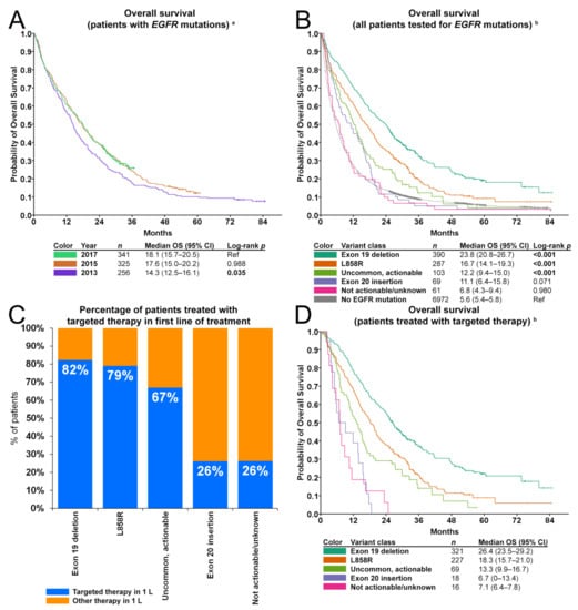 First-line targeted therapy and overall survival. (A) Kaplan-Meier curve depicting overall survival by year of diagnosis, irrespective of first-line treatment. Censored cases are indicated with a +. (B) Kaplan-Meier curve depicting overall survival by mutation class, irrespective of first-line treatment. Censored cases are indicated with a +. (C) Percentage of patients treated with targeted therapy in first-line of treatment, by EGFR mutation class. (D) Kaplan-Meier curve depicting overall survival of EGFR-mutant patients treated with targeted therapy in first-line of treatment. Censored cases are indicated with a +. a Excluding patients with missing follow-up data (n = 3). b Excluding patients with missing follow-up data (n = 3) and patients reported to have a non-specified EGFR mutation (n = 12). Abbreviations: 1 L; first-line of treatment; CI, confidence interval; EGFR, epidermal growth factor receptor gene; p, level of significance; OS, overall survival.