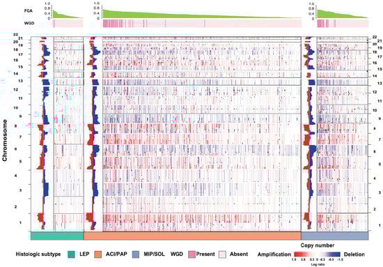 Analysis of copy number alterations by histologic subtype of invasive lung adenocarcinoma. The copy number heat map with amplifications (red) and deletions (blue) by histologic subtype, arranged by decreasing FGA. ACI, acinar; FGA, fraction of genome altered; LEP, lepidic; MIP, micropapillary; PAP, papillary; SOL, solid; WGD, whole-genome doubling. (From Journal of Thoracic Oncology, Caso, R.; Sanchez-Vega, F.; Tan, K.S.; Mastrogiacomo, B.; Zhou, J.; Jones, G.D.; Nguyen, B.; Schultz, N.; Connolly, J.G.; Brandt, W.S., “The underlying tumor genomics of predominant histologic subtypes in lung adenocarcinoma.” Vol. 15, 1844–1856. Copyright © (2020) Elsevier. Reprinted with permission).