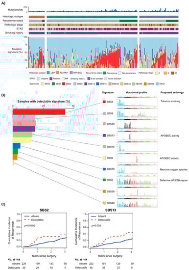 Analysis of somatic mutational signatures. (A) Bar plots of detectable mutational signatures (colored) by individual tumors. Tracks above the bar charts indicate (1) somatic mutations, (2) histologic subtype, (3) recurrence status, (4) pathologic stage, (5) tumor STAS, and (6) smoking history. (B) Distribution of select detectable signatures across all tumors and their representative mutational profiles and the proposed cause. (C) Cumulative incidence of postresection recurrence curves according to SBS2 and SBS13 mutational signature status across all patients. ACI, acinar; HR, homologous recombination; LEP, lepidic; MIP, micropapillary; NA, not available; PAP, papillary; SBS, single-base substitution; SOL, solid; STAS, spread through air spaces. (From Journal of Thoracic Oncology, Caso, R.; Sanchez-Vega, F.; Tan, K.S.; Mastrogiacomo, B.; Zhou, J.; Jones, G.D.; Nguyen, B.; Schultz, N.; Connolly, J.G.; Brandt, W.S., “The underlying tumor genomics of predominant histologic subtypes in lung adenocarcinoma.” Vol. 15, 1844–1856. Copyright © (2020) Elsevier. Reprinted with permission).