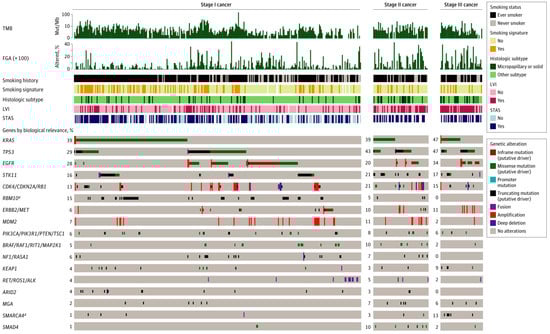 Oncoprint by pathologic stage with annotated clinicopathologic variables. Genes are grouped by biological relevance in lung adenocarcinoma. FGA, fraction of genome altered; LVI, lymphovascular invasion; Mut/Mb, mutations per megabase; STAS, spread through air spaces; TMB, tumor mutation burden. a p < 0.05, false-discovery rate, for difference in alteration frequency between stages using Fisher’s exact test. (From JAMA Surgery, Jones, G.D.; Brandt, W.S.; Shen, R.; Sanchez-Vega, F.; Tan, K.S.; Martin, A.; Zhou, J.; Berger, M.; Solit, D.B.; Schultz, N., “A genomic-pathologic annotated risk model to predict recurrence in early-stage lung adenocarcinoma.” Vol. 156, e205601–e205601. Copyright © (2021) American Medical Association. Reprinted with permission).