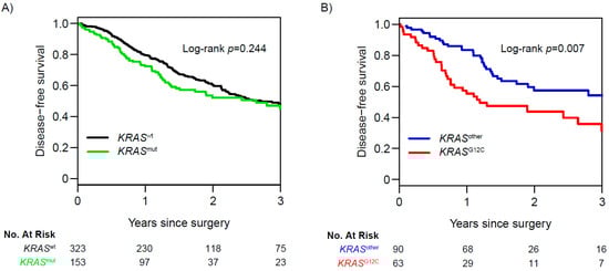 NSCLC is often driven by specific oncogenic alterations, and while they represent potential therapeutic targets, they also provide important information regarding tumor biology and the likelihood of recurrence (Figure 3). At the individual gene level, alterations in genes such as TP53, SMARCA4, CDKN2A, CTNNB1, ALK, ROS1, and RET, among others, have been associated with higher levels of recurrence in patients with stage I–III disease [8,25,26,27]. In contrast, alterations in EGFR and the RNA-binding protein gene RBM10 have been associated with a better prognosis [8,25]. As an example of how individual gene alterations may be used, we recently examined the prognostic value of KRAS G12C mutations. KRAS mutations are among the most common alterations in NSCLC, and the KRAS G12C mutation, in particular, has specific importance due to its association with poor outcomes and the recent development of specific G12C inhibitors. We reported that, in 604 patients with LUAD who underwent complete surgical resection, KRAS G12C mutation was an independent predictor of worse 3-year DFS, compared with wild-type and other KRAS mutations. We then validated our observations using The Cancer Genome Atlas cohort (N = 426) (Figure 4A,B) [28]. Although it was long thought that such KRAS mutations were undruggable, recent drug discovery efforts have resulted in Federal Drug Administration approval of sotorasib (AMG-510), a specific KRAS G12C inhibitor for patients with locoregionally advanced metastatic NSCLC.