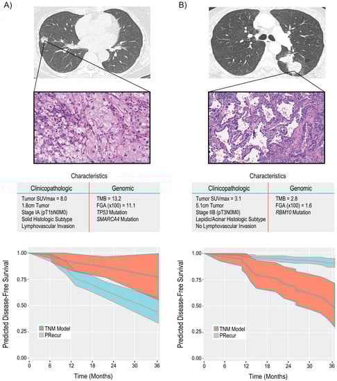 Computational machine-learning prediction model (PRecur) for disease-free survival applied to two patient scenarios. (A) Patient with a small, 1.8-cm tumor (pT1bN0M0, stage IA). Three-year disease-free survival curves were predicted by PRecur versus the tumor-node-metastasis model for all patients with pT1bN0M0 disease in our cohort (n = 136). (B) Patient with a large, 5.1-cm tumor (pT3N0M0, stage IIB). Three-year disease-free survival curves were predicted by PRecur versus the tumor-node-metastasis model for all patients with pT3N0M0 disease in our cohort (n = 53). FGA, fraction of genome altered; TMB, tumor mutation burden. (From JAMA Surgery, Jones, G.D.; Brandt, W.S.; Shen, R.; Sanchez-Vega, F.; Tan, K.S.; Martin, A.; Zhou, J.; Berger, M.; Solit, D.B.; Schultz, N., “A genomic-pathologic annotated risk model to predict recurrence in early-stage lung adenocarcinoma.” Vol. 156, e205601–e205601. Copyright © (2021) American Medical Association. Reprinted with permission).