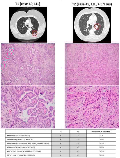 Interestingly, we observed that the use of identical KRAS mutations to determine clonality was often incorrect. In our study, we found that the use of broad-panel NGS helped to discriminate unrelated tumors (SPLCs) that shared a single common hotspot mutation by chance. In specific populations, this can be especially problematic [58]. For example, in smokers with tumors sharing a KRAS G12C mutation or in never-smokers with tumors sharing an EGFR exon 21 L858R mutation, the odds of co-occurrence by chance can be as high as 1 in 17. In our series, shared KRAS mutations were almost as likely to occur coincidentally in SPLCs as in IPMs [55]. As an example, a patient underwent a sublobar resection of a peripheral left lower lobe LUAD and then, 5.9 years later, developed a new left lower lobe LUAD that had increased SOL and MIP histologic subtyping. Although this was thought by the clinicians to be an SPLC, NGS confirmed that it was an IPM (Figure 6). Other groups have recently reported similar findings using CNA [60].