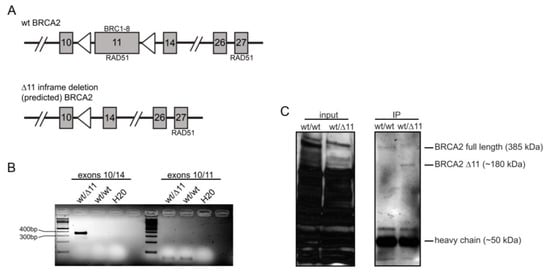 Brca2 delta 11 isoform. (A). Schematic of mouse wild-type (wt) Brca2 and Brca2 delta 11 deletion following Cre activity. Hatched lines represent excluded genomic regions and triangles (loxP sites). RAD51 interacts with BRCA2 at two distinct domains (i.e., the BRC repeats located in exon 11 and the c-terminal region of BRCA2) as noted. (B). PCR amplification of cDNA from BRCA2 wild-type and delta 11 isoform mouse testis for products encompassing exons 10 and 14 (362 bp product) and exons 10 and 11 (67 bp product). (C). Western blot depicting full-length BRCA2 and delta 11 deletion isoform protein products immunoprecipitated from mouse testis whole-cell lysates (original full Western Blot image provided in Figure S1).