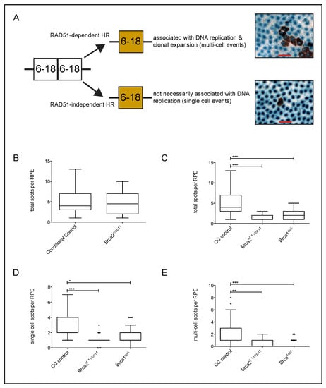 While the in vitro (tissue culture) data are in agreement, the requirement of BRCA2 for mouse development impedes our ability to test the in vivo function. Our laboratory previously incorporated a conditional system for measuring spontaneous HDR events in vivo by combining the pink-eyed unstable (pun) mouse model with a tissue-specific Cre/loxP recombinase system to conditionally delete genes of interest [14]. This strategy allows the examination of the effect of essential genes on HDR in vivo. To summarize, the in vivo HDR assay used the pun mouse model results from a tandem duplication of approximately 70 kb within the murine pigmentation p gene (also referred to as Oca2). Following the removal of one of these repeats, a nonfunctional p gene is converted into a single copy functional wild-type allele that can be observed phenotypically as a pigmented spot on the fur or retinal pigment epithelium (RPE). Based on studies by our laboratory [14,15,16,17], as well as studies using an analogous model in yeast [18], it is most likely that the deletion/reversion of a large tandem repeat (2 × 70kb) such as in the pun allele is a HDR-mediated event. Furthermore, our results to date suggest that the pun model can detect both RAD51-dependent (e.g., HR events such as unequal gene conversion or crossover events that occur in S-phase to G2-M) and -independent (e.g., SSA) events; this is based on Parp1 deletion and Blm deletion resulting in an increase in mainly multi-cell spots (clonal expansion indicating the event occurred in an actively dividing cell and thus likely replication-tied) while Brca1 mutation leaves only single-cell events (indicating an event not necessarily associated with replication) [14,17].