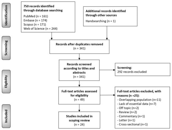 The flow diagram (Figure 1) depicts the results obtained in the study identification and selection process. A total of 750 publications were retrieved: 244 from Web of Science, 174 from Embase, 171 from Scopus, 161 from PubMed and 1 handsearching the reference lists. After duplicates removal, 341 records were considered potentially eligible and screened according to titles and abstracts, leaving a sample of 49 studies for full text evaluation. Finally, 24 studies meeting all eligibility criteria were included for critical analysis and evidence synthesis in our scoping review [,,,,,,,,,,,,,,,,,,,,,,,].