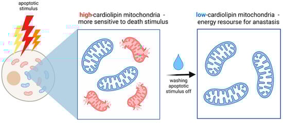 Cardiolipin deficiency results in an increase in mitochondrial size and the absence or disorganization of cristae structures, which are important for apoptosis to proceed. Mitochondria with a low cardiolipin content have low membrane potential, while mitochondria with a high cardiolipin content exhibit higher membrane potential [31]. It was hypothesized that high cardiolipin-containing mitochondria had a large negative charge inside, which would theoretically more attract Ca2+ than the less polarized mitochondria, therefore, making them more sensitive to apoptotic stimulus [31]. Thus, low cardiolipin-containing mitochondria can resist death signals and be a source of energy for anastasis afterward (Figure 1).