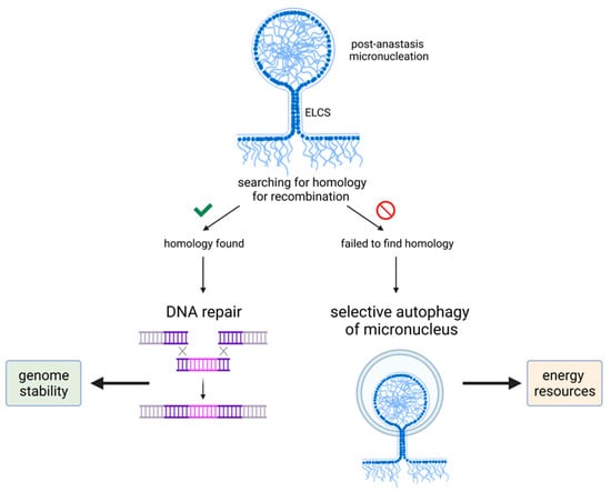 Both autophagic and non-autophagic micronuclei were in close vicinity to the main nuclei of polyploid cells or formed chromatin buds, allowing us to suggest that they could be connected with the nuclei through the nuclear envelope [95]. There are particularly notable structures called envelope limited chromatin sheets (ELCS), which are characterized by extensions of the nuclear envelope that surrounds one or more ~30-nm-thick chromatin sheets [96]. ELCS is thought to be a result of aberrant mitosis or mitotic slippage after genotoxic treatment or spindle perturbation and is used as a marker of poor prognosis in leukemia [97]. The cells where ELCS appeared after failed mitosis did not undergo immediate cell death. They eventually died, but via extremely protracted and delayed apoptosis. These observations might suggest that the appearance of ELCS precedes the point-of-no-return of cell death; however, mitotic catastrophe cannot be excluded [97]. As a possible mechanism of delaying apoptosis via ELCS, it was suggested that micronuclei could provide DNA material for HR and deliver it to the main nucleus by ELCS through nuclear rotation [94]. If the repair system fails to find a homologous site, the micronuclei are fated for selective autophagy [95]. Therefore, both non-autophagic and autophagic micronuclei may contribute to facilitating genome stability in ETCs. This model could explain why the majority of micronuclei are not observed in the process of autophagic degradation. They can be instead engaged in DNA repair and chromatin resorting [95]. Besides micronuclei, in cytoplasmic pockets of ELCS mitochondria and multiple autophagic vesicles are often observed in genotoxic-treated endopolyploid lymphoma cells [97]. It could mean that the autophagy of cytoplasmic contents cooperates with autophagic removal of chromatin in micronuclei for maintaining genome stability by at least two mechanisms: (1) by constructing DNA material for cells undergoing protracted DNA repair, and (2) more directly, by providing nutrients and consequently the energy needed for nuclear rotation by microtubules at the site of the ELCS pockets [95]. Taken together, it became clear that micronuclei could provide an effective road to anastasis.