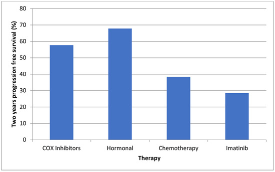 The two-year PFS rates in our study were between 57–67% for these treatment groups, demonstrating a less optimal response than previous retrospective studies, but a much better response than that seen in the pediatric one [33]. The long duration of COX inhibitors and hormonal therapy in our cohort may support their role as a viable first-line therapy due to their moderate effectiveness and low related morbidity.