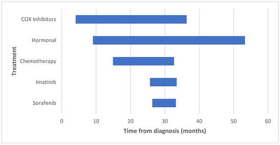 The two-year PFS is displayed in Figure 1. Only one patient on sorafenib therapy was treated for over 2 years; therefore, we looked at the median treatment duration (6.8 months), by which only 1/9 (11.1%) patients failed sorafenib therapy. COX inhibitors and hormonal therapy were initiated early after tumor diagnosis, at a median of 4.1 and 9.1 months, respectively. These drugs were used for the longest duration (median of 32.2 and 44.1 months, respectively). Table 3 and Figure 2 illustrate the initiation and duration of all medications.
