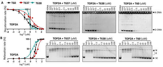 T637 and T638 are TOP2A inhibitors. (A) K-DNA decatenation assays and (B) supercoiled plasmid DNA relaxation assays are used to measure TOP2A enzyme activity in the presence of 0.01–200 uM T637 or T638. Three biological repeats were performed with each concentration of the compounds, and the densitometry of the D-DNA bands from (A) and the SC bands from (B) was used to establish an inhibition curve for IC50 calculation.