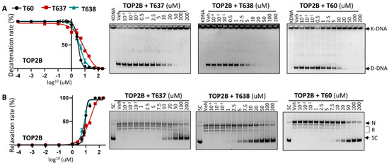 T637 and T638 are TOP2B inhibitors. (A) K-DNA decatenation assays and (B) supercoiled plasmid DNA relaxation assays are used to measure TOP2B activity in the presence of 0.01–200 uM T637 or T638. Three biological repeats were performed with each concentration of the compounds, and the densitometry of the D-DNA bands from (A) and the SC bands from (B) was used to establish an inhibition curve for IC50 calculation.