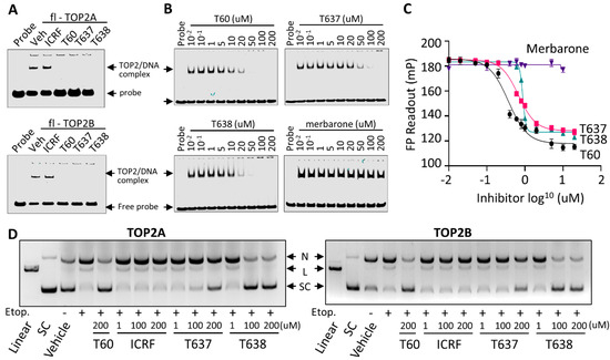 T637 and T638 block TOP2–DNA interaction and prevent TOP2 mediated DNA cleavage. (A) EMSA was performed by purified full-length TOP2A or TOP2B proteins at a contraction of 300 nM with IRDay700 labeled 5ZRF DNA oligo at a concentration of 100 nM in the presence of −/+200 µM of ICRF193, T60, T637, and T638. (B) EMSA was performed by incubating 2 uM of purified human TOP2A(431-1193) with 300 nM of IRDay700 labeled 5ZRF DNA oligo in the presence of −/+T60, T637, T638, or merbarone. (C) FP assay was performed by incubating 500 nM of the purified human TOP2A(431-1193) with 1 nM of 3’ 6-FAM labeled 5ZRF DNA oligo in the presence of 0.01–200 µM of T60, T637, T638, or merbarone. Reactions were subjected to fluorescence emission of 485 nm and excitation of 535 nm, which were detected by using the Multimode Microplate Reader (Infinite F500). (D) DNA cleavage assays were performed using full-length human TOP2A and TOP2B incubated with the supercoiled pHOT plasmid in the presence of 200 µM of etoposide plus 1, 100, or 200 µM of ICRF193, T60, T637, and T638. Reactions were separated on a DNA gel with ethidium bromide. All experiments were repeated three times, and one representative image was shown. Note: N, nicked DNA; L, linear DNA; and SC, supercoiled DNA. Full Website Blot Figures are shown in the Supplementary Materials.