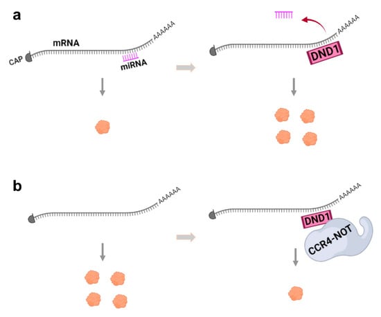 The two major mechanisms of DND1 function. (a) Interaction of DND1 with mRNA blocks miRNA access to mRNA to up-regulate translation and protein expression. (b) DND1 can also bind to mRNA to target it for destruction by the CCR4-NOT complex, thus decreasing translation and protein expression. These mechanisms may be cell-type- or mRNA-specific.