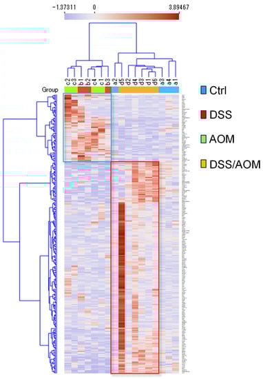 Whole transcriptome analysis of mouse colonic mucosa. Heatmap showing unsupervised hierarchical clustering of genes differentially expressed in DSS/AOM-treated mice. Clustering was based on Euclidean distance and Ward’s linkage. Blue square represents genes upregulated in DSS and AOM mice and red square represents genes upregulated in DSS/AOM mice. Ctrl; control, DSS, dextran sodium sulfate; AOM, azoxymethane; DSS/AOM; dextran sodium sulfate + azoxymethane.