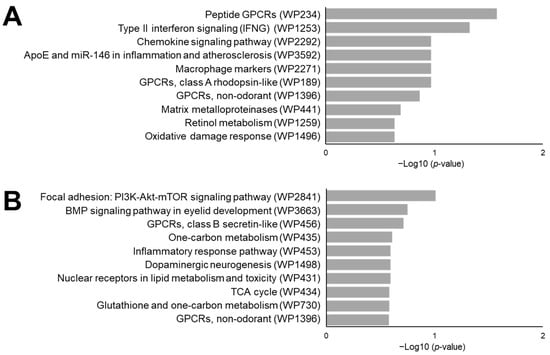 Functional gene expression profiling of colonic mucosa of DSS/AOM mice and control mice. The top ten biological pathways from the mouse 2019 WikiPathways database enriched from genes upregulated in DSS- and AOM-treated mice (blue square in Figure 2) (A) and genes upregulated in DSS/AOM-treated mice (red square in Figure 2) (B). DSS, dextran sodium sulfate; AOM, azoxymethane, DSS/AOM; dextran sodium sulfate + azoxymethane, GPCRs; G protein-coupled receptors, BMP; bone morphogenetic protein, WP; WikiPathways.