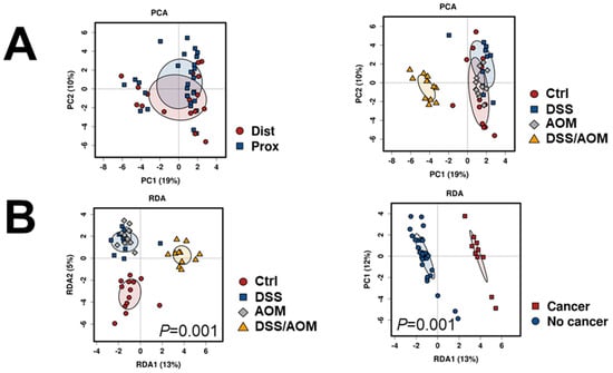 DNA was extracted from the fecal samples and bacterial 16S rDNA regions were amplified using PCR and two primer pools covering variable regions (V2–V4, V6–V9) from the Ion 16S Metagenomics Kit (Thermo Fisher Scientific), according to the manufacturer’s instructions [24]. For library preparation, the V2, V3, V4, V6, V7, V8, and V9 16S rRNA regions were amplified, followed by end-repair and barcoded-adaptor ligation using the Ion Plus Fragment Library Kit (Thermo Fisher Scientific). The pooled library was sequenced as single-end 400-bp reads using the Ion S5 sequencing kit (Thermo Fisher Scientific). The FASTQ files were analyzed using the CLC Genomics Workbench version 12.0 (Qiagen) and the Microbial Genomics Module (Qiagen). Sequence reads were clustered into operational taxonomic units (OTUs) with a 99% identify threshold against the Greengenes database, version 13.8. A set of sequences representing OTUs were analyzed using Calypso (version 8.84) [25]. OTU abundance was normalized with cumulative-sum scaling (CSS) and log2 transformation. Samples with a total read count <1000 were filtered from subsequent analyses. An analysis of similarities (ANOSIM) and a principal component analysis were carried out to assess dissimilarity. Redundancy analysis (RDA) was used as a constrained ordination method to determine the degree of variance according to variables [25,26]. Hierarchical clustering and heatmap, using the Bray-Curtis distance metric, and Linear discriminant analysis Effect Size (LEfSe) were carried out in Calypso. Pearson correlation analysis of OTUs correlated to treatment were generated using MicrobiomeAnalyst [27]. Prediction of Kyoto Encyclopedia of Genes and Genomes (KEGG) pathways in the control and DSS/AOM-exposed groups were inferred from OTU abundances in Piphillin [28].