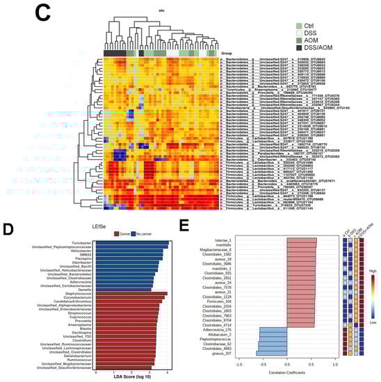 Next, we aimed to identify taxa most likely to be associated with DSS/AOM-induced carcinogenesis. LEfSe analysis revealed genus-level taxa associated with fecal samples from tumor bearing DSS/AOM-treated mice compared to all other treatment groups (Figure 4D). We subsequently performed correlation analysis using Pearson’s coefficient to correlate individual OTUs to specific treatment. Of the top 25 OTUs, 19 were correlated to DSS/AOM samples, notably 11 of these (59%) were classified as Clostridiales and three (27%) were classified as Staphylococcus aureus (Figure 4E).