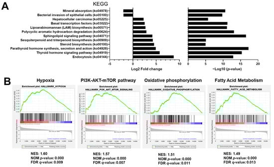 Integrated functional prediction profiling. Piphillin was used to infer and compare functional metabolic pathways from 16S rDNA sequencing abundance data altered in fecal samples from DSS/AOM-treated mice. (A) Bar plots showing the fold change (left panel) and the −log10 p value (right panel) of the top 12 KEGG pathways enriched in DSS/AOM-treated mice versus controls (Kyoto Encyclopedia of Genes and Genomes, https://www.kegg.jp, access date: 11 May 2021). (B) Gene set enrichment analysis showing key related-signaling pathways altered in the normal mucosal of DSS/AOM-treated and control mice. NES, normalized enrichment score; NOM p value, nominal p value (<0.05 was considered significant); FDR q value: false discovery rate (<0.25 was considered significant), DSS/AOM; dextran sodium sulfate + azoxymethane.