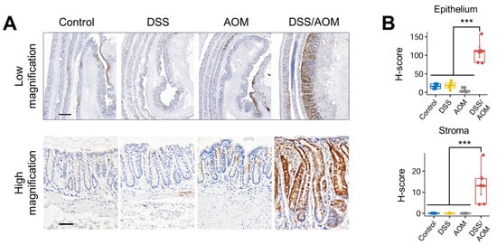Immunohistochemical analysis of phosphorylated S6 ribosomal protein. (A) Representative photomicrographs of phosphorylated S6 immunostaining in the distal colons of control, DSS-, AOM-, and DSS/AOM-treated mice showing low magnification and high magnification fields. Low magnification scale bar = 500 µm and high magnification scale bar = 100 µm. (B) H-scores of p-S6 in the epithelium (upper) and stroma (lower) of the distal colonic mucosa. ANOVA p value < 0.001 and post hoc statistical analysis was performed using Student-Newman-Keuls Method; *** p < 0.001, DSS, dextran sodium sulfate; AOM, azoxymethane, DSS/AOM; dextran sodium sulfate + azoxymethane, ANOVA; analysis of variance.