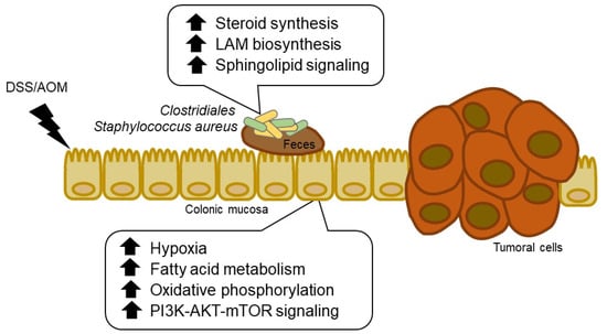 Here, we have shown that inflammatory and carcinogenic effects of DSS and AOM cooperate to induce carcinogenesis in mice. Moreover, our gene expression and metagenomic studies revealed altered transcriptomic signatures in tumor normal adjacent colonic mucosa and dysbiosis of fecal microbes. While our study is exploratory and a causal relationship has not been established, our findings suggest that structural compositional changes of gut microbes promulgated by the development colonic tumors may have further altered the normal adjacent mucosa, possibly increasing the risk of malignant transformation or further promoting cancer progression of established tumors. Changes in microbial composition, such as the Firmicutes/Bacteroides ratio, termed dysbiosis, and disruption of the immunological homeostasis has been associated with inflammatory diseases [36,37]. We identified taxa most likely to be associated with DSS/AOM-induced carcinogenesis. Enriched abundances of Clostridiales and Staphylococcus aureus were observed (Figure 3E). Clostridiales have been reported to be less abundant in human patients with IBD but enriched specific Bacteroides were also reported [38,39]. Increased abundance of Staphylococcus aureus was also observed in DSS/AOM samples (Figure 3E). Toxin produced by Staphylococcus aureus influences the microenvironment, possibly lipoteichoic acid and peptidoglycan produced by Staphylococcus aureus, as Toll-like receptor 2 ligands, such as lipoarabinomannan (LAM), stimulates mature mast cells to cysteinyl leukotriene synthesis and causes inflammation and immune response [40]. Staphylococcus aureus might influence the sphingolipid pathway; Alpha-toxin produced by Staphylococcus aureus induces inflammatory cytokines via lysosomal acid sphingomyelinase and ceramides and disrupts endothelial-cell tight junctions [40,41].